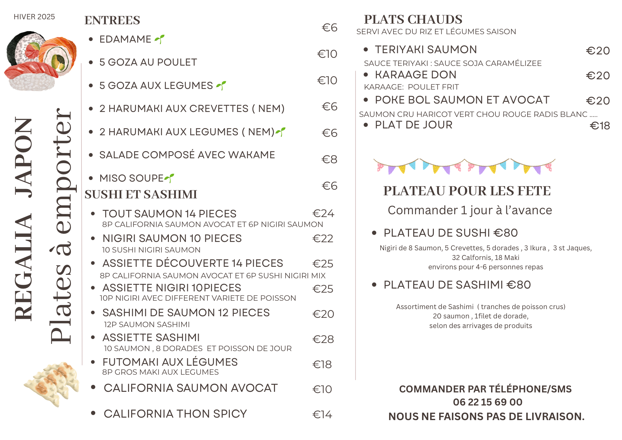 avec nos sushis fraîchement préparés, idéals pour une dégustation relaxante à la maison ou lors de votre séjour en gîte de vacances. Pour profiter d'un service rapide et sans attente, pensez à commander à l'avance !